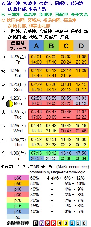 ◆磁気嵐ロジック/世界M6+発生確率 [1/23 08:30更新]