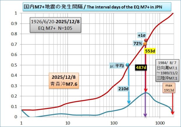 2024.8/8日向灘M7.1~2025.12/8青森沖M7.6は、487日間停止、平均の2.32倍