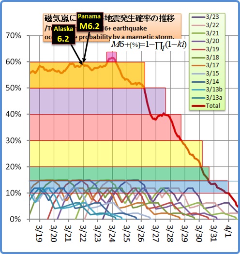 元々は磁気嵐によるM6超クラスの発生確率(遅延特性を含む)をUSGSデータ39年分から調査