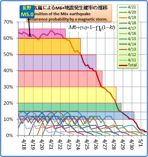 元々は磁気嵐によるM6超クラスの発生確率(遅延特性を含む)をUSGSデータ39年分から調査