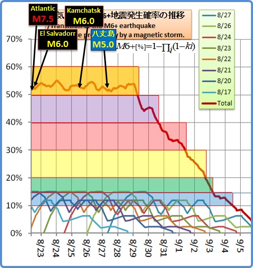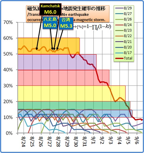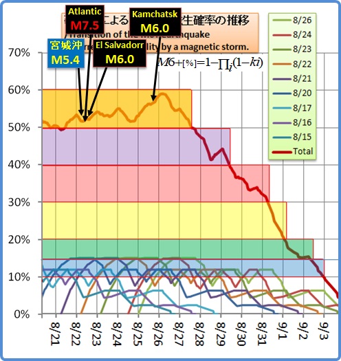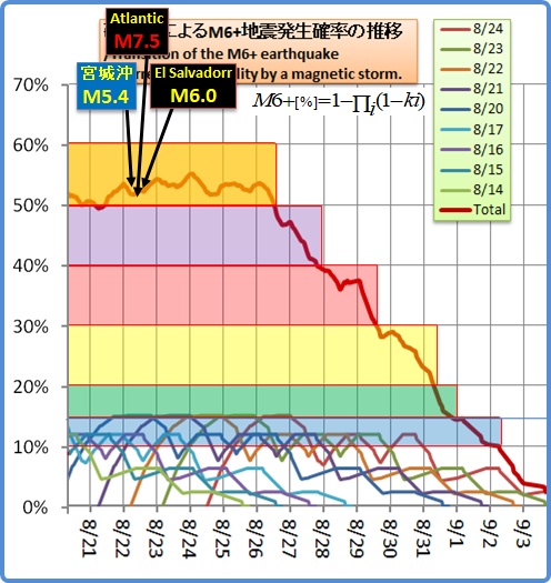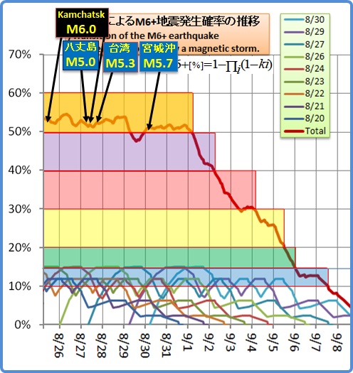 元々は磁気嵐によるM6超クラスの発生確率(遅延特性を含む)をUSGSデータ39年分から調査