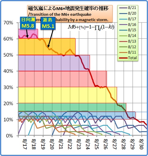 元々は磁気嵐によるM6超クラスの発生確率(遅延特性を含む)をUSGSデータ39年分から調査