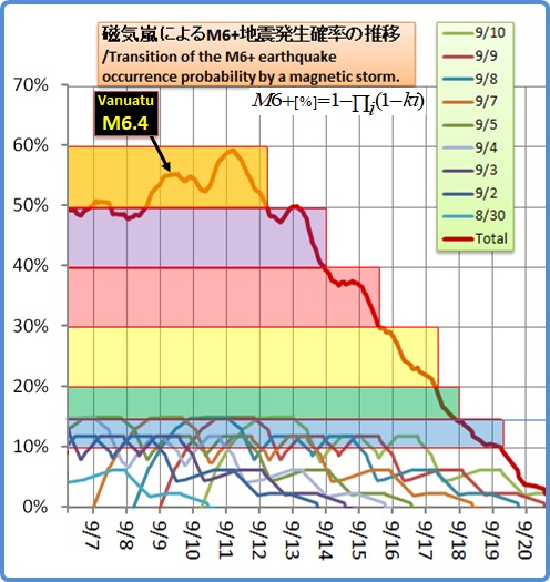 元々は磁気嵐によるM6超クラスの発生確率(遅延特性を含む)をUSGSデータ39年分から調査