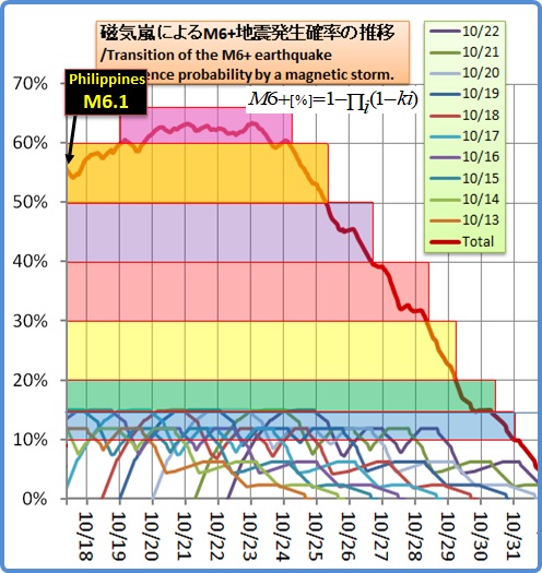 元々は磁気嵐によるM6超クラスの発生確率(遅延特性を含む)をUSGSデータ39年分から調査