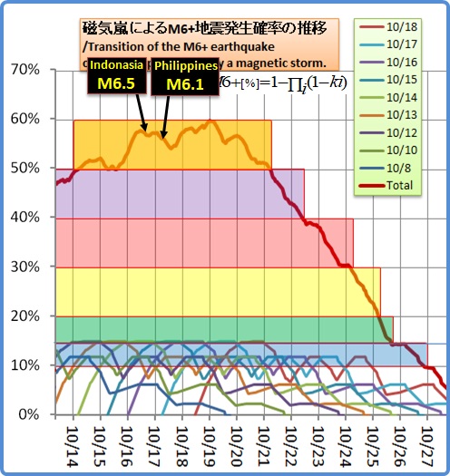 元々は磁気嵐によるM6超クラスの発生確率(遅延特性を含む)をUSGSデータ39年分から調査